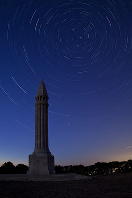 Filé d'étoiles au monument Barrès avec le passage d'une étoile filante.